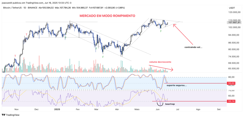 O gráfico diário do Bitcoin (BTC/USDT) mostra um mercado técnico em seu estado mais clássico: rompimento de padrão, compressão de volatilidade e rejeição clara de armadilhas. Este é o tipo de cenário que traders de price action acompanham de perto e que pode oferecer ótimas oportunidades nos próximos dias. Contexto Geral: Tendência de Alta e […]